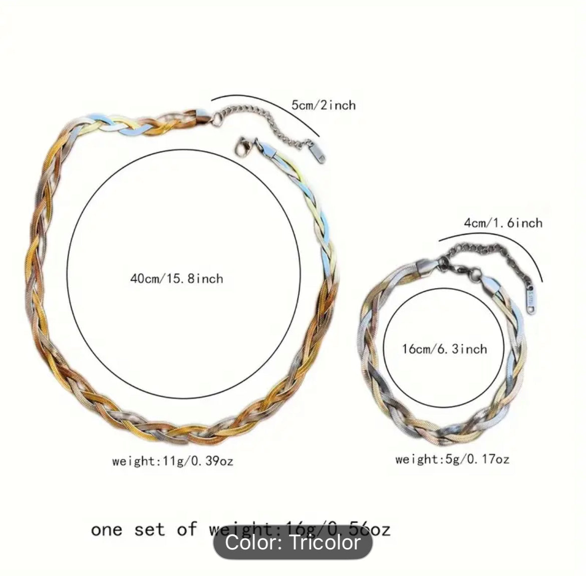 - Two-piece set: includes 1 necklace and 1 bracelet in stainless steel
